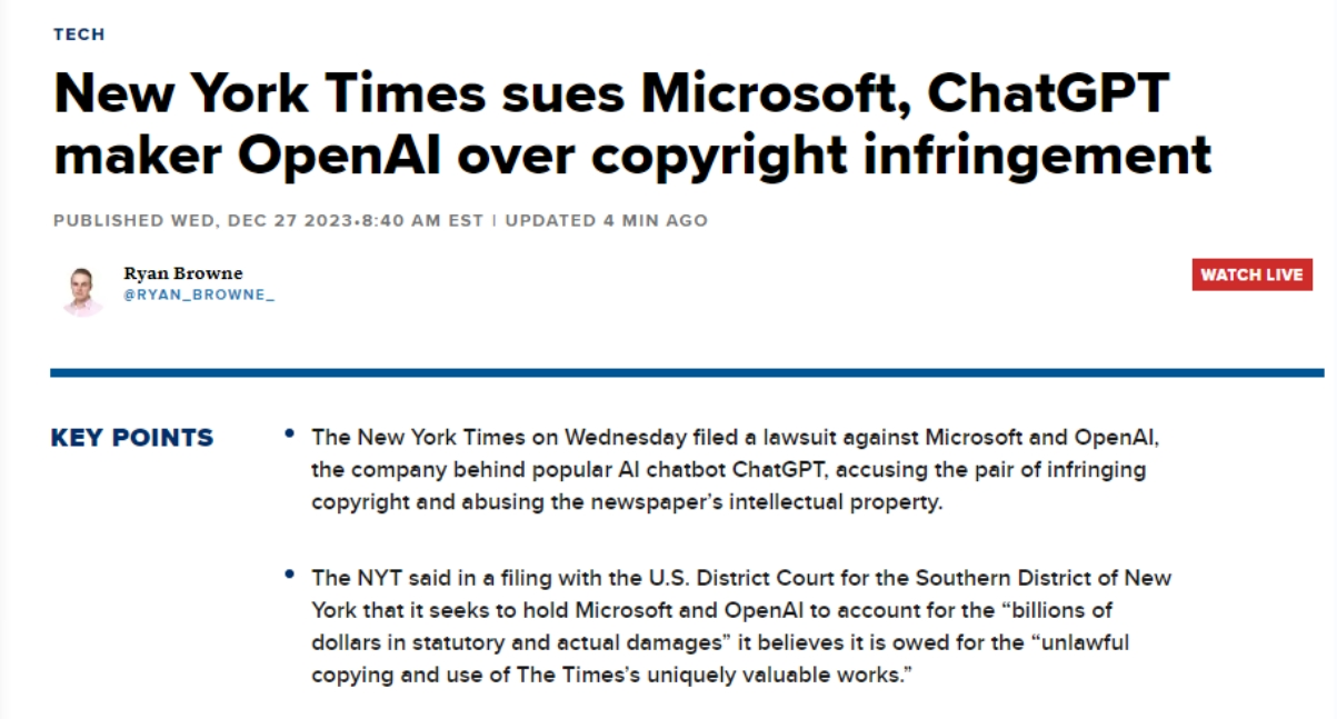 纽约时报此后正在一份电邮声明中暗示,据公开动静,《纽约时报》是第一家告状这两家公司其文字做品版权的美国大型机构。这种手段了《纽约时报》取读者的关系,生成式AI继续繁荣成长,OpenAI和微软出格强调这些AI正在锻炼时利用了《纽约时报》的旧事报道,包罗《纽约时报》、透社、BBC和CNN等机构已屏障了OpenAI的收集爬取,据称,微软的Bing Chat供给了据称是来自《纽约时报》的错误消息。